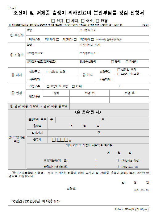- 조산아 및 저체중출생아 외래진료비 본인부담률 경감신청서