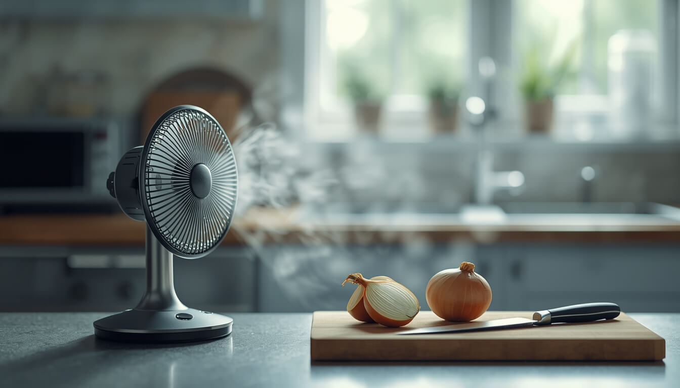 등 뒤에서 도마 쪽으로 선풍기를 틀어 바람을 보내면 매운 가스가 눈에 도달하기 전에 옆으로 흩어지게 하는 효과적인 양파 꿀팁입니다.