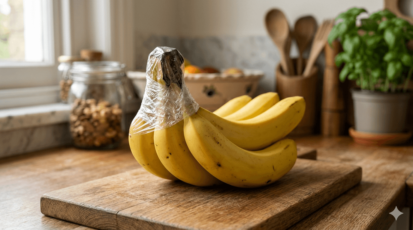 그런데 꼭지 부분에 랩 한 겹만 감아두면 바나나 보관법 중에서 가장 간단하면서도 효과가 큰 방법이 된다는 사실, 알고 계셨나요?
